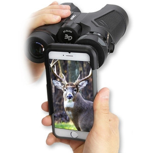 met verrekijkeradapter voor verrekijkers met een diameter van 32-50 mm oculair. Deze verrekijkeradapter wordt geleverd met 2 verwisselbare rubberen ringen. Zodra u een rubberen ring hebt gekozen voor de juiste grip op het oculair, drukt u deze stevig aan en kunt u verbazingwekkende en buitengewone beelden op uw Smartphone zien. Ideaal voor bijvoorbeeld de jacht of vogels kijken.