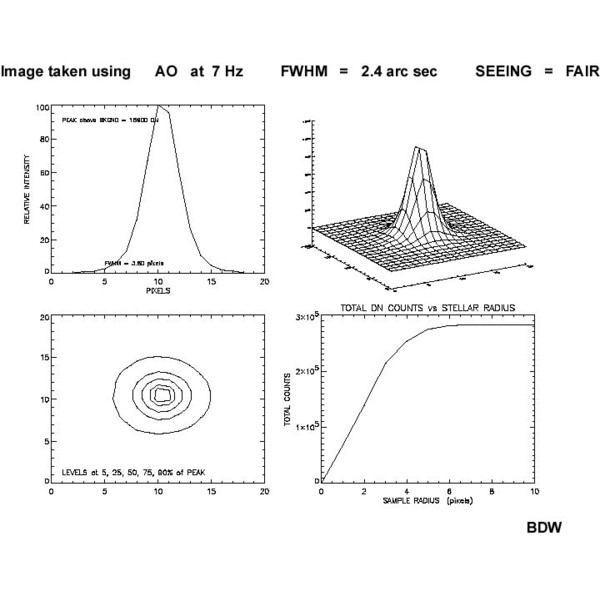 The improvement in stellar profiles can be seen at corrections above 1Hz. The upper picture on the right shows the non-AO guided image. And comparing the non-AO guided image to the AO guided image there is again significant improvement in the FWHM of the star profile (second picture on the right).