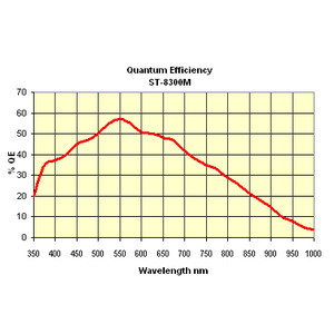 Quantum Efficiency: In the past, one of the drawbacks in using sensors with small pixels and antiblooming structure has been the trade-off of some quantum efficiency. However, Kodak's microlens technology has largely made this trade-off a thing of the past. The KAF-8300 uses microlenses to focus more light on each pixel that would otherwise be lost due to the opaque antiblooming gate structure of the sensor. As a result, the KAF-8300 antiblooming protection can handle up to 1000X the full well saturation and at the same time this CCD has a quantum efficiency comparable to that of a full frame sensor without ABG. Moreover, the QE curve for this full frame sensor has a peak in the middle of the visual spectrum and good sensitivity well into the red and near IR. The QE at the important wavelength of H-alpha is nearly 50%.
