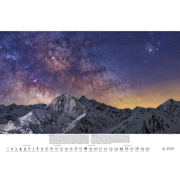 Het royale formaat van deze wandkalender (50 x 70 cm) laat de 12 indrukwekkende nachtopnames volledig tot hun recht komen. De kalenderonderdelen zijn bewust ingetogen gehouden om de foto's alle ruimte te geven.