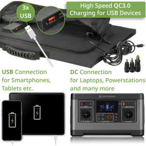 Alle apparaten met een USB-voedingsaansluiting of de bovengenoemde DC-holle stekker zijn met de zonne-lader in een handomdraai weer klaar voor gebruik, bijvoorbeeld smartphones, tablets, powerbanks, draagbare PlayStations, MP4-spelers, GPS-apparaten en Bluetooth-hoofdtelefoons. Voor het opladen van grote powerstations raden wij de krachtigere BRESSER-zonnepanelen met een uitgangsvermogen van minimaal 60 watt aan – zie art.nr. 3810050, 3810060, 3810070.