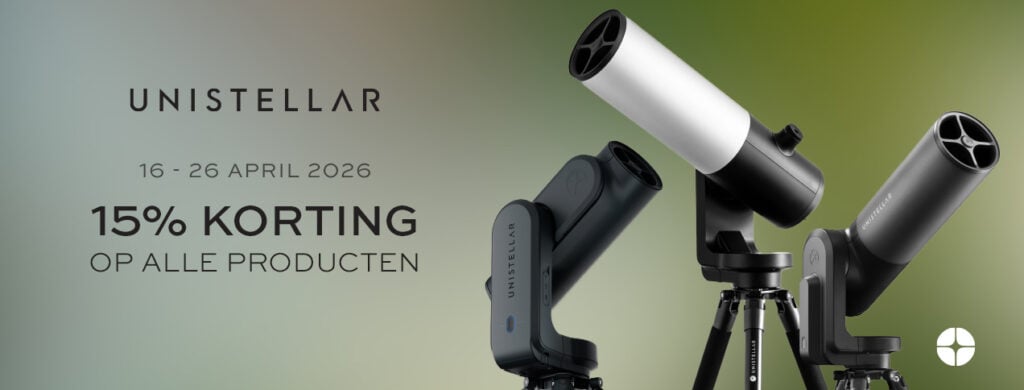Van 16 – 26 april 2026 geeft de Franse fabrikant Unistellar 15% korting op alle producten (slimme telescopen en accessoires).