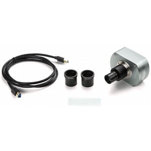 De levering omvat een 0,75x-objectief met c-mount, een USB 3.0-kabel, een 30 en 30,5 mm-adapter voor stereo miscroscopen en een 76 x 24 mm kalibratieglas 1 mm/100. Alle onderdelen zijn verpakt in een stevige kartonnen doos.