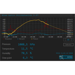 Toepassing in de astronomie: Moderne high-end monteringen hebben toegang nodig tot actuele weergegevens om de invloed van de atmosferische refractie correct te compenseren. De gegevens moeten ter plaatse worden bepaald en zijn van invloed op zowel de positionering als de nagevolging. Voor telescopen die vast in een observatorium zijn geïnstalleerd, bieden wij weerstations aan, die echter niet geschikt zijn voor mobiel gebruik. Het Blue Astro USB-weerstation kan flexibel mobiel of stationair worden gebruikt.