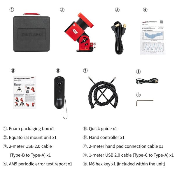 ZWO biedt met de Harmonic Equatorial Mount AM5 een draagbare montering voor astrofotografie. De montering weegt minder dan 5 kg en kan telescopen tot 13 kg zonder tegengewicht dragen. Met tegengewicht en de tegengewichtstang (niet bij de levering inbegrepen) kan de montering zelfs telescopen tot 20 kg dragen. Jarenlang ontwikkelingswerk en diverse patenten zitten in deze spannende montering.