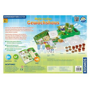 Inhoud: kas, zaadzakjes (erwten, tuinkers, dwergzinnia), 6 potgrondpellets, 6 plantpotjes, thermometer, gips, pipet, 5 maatbekers, plastic buisjes, wolgaren, houten stokjes, spatel, stansvellen, poster, handleiding (48 blz.).