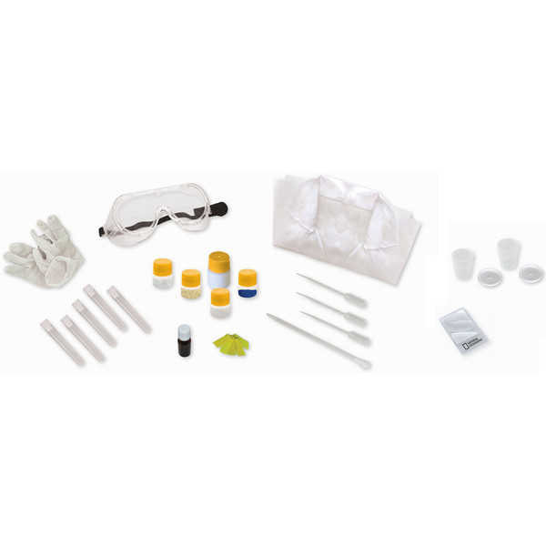Leveringsomvang: veiligheidsbril, wegwerplaboratoriumjas, beschermende handschoenen, pH-teststrips, maatbeker, plastic reageerbuisjes, plastic spatel, bakje voor de lakmoesoplossing, lakmoespoeder, kaliumhexacyanidoferraat, ammoniumijzer(II)sulfaat, natriumcarbonaat, citroenzuur, pasteurpipetten, Fresnel-vergrootglazen, handleiding