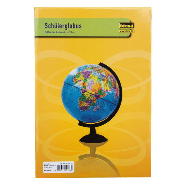 Met een diameter van 18 cm is de Idena schoolglobe het ideale leermiddel. De politieke kaart geeft een overzicht van de aarde, continenten, landen, steden, bergen en zeeën. De landen zijn in verschillende kleuren weergegeven en de zeeën in blauw. Op de zwarte kunststof houder bevindt zich een schaalverdeling van de breedtegraden van onze planeet. De schoolglobe is voorzien van een zeer stabiele, zwarte kunststof voet en een zwarte meridiaan. De globe wordt gemonteerd geleverd en is niet alleen een uitgebreide bron van informatie, maar ook een mooi woonaccessoire.