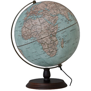De globe ANTIQUE CIRCLE LIGHT is geïnspireerd op de klassieke elegantie van de eeuwwisseling en overtuigt door zijn betrouwbare gevoel voor stijl. Karakteristieke details zijn de fraai vormgegeven voet van gedraaid hout, het oud messingkleurige metalen frame en de historisch aandoende wereldbol in pastelblauw en roze.