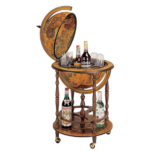 Staande barglobe met prachtige illustraties op de kaart; van zeemonsters, sirenen en mythologische figuren. De Regolo-globe heeft binnenin een drankcompartiment met ruimte voor 2-3 lage flessen en ongeveer 9 glazen. Extra flessen kunnen op de onderste legplank worden geplaatst, die versierd is met een windroos en volledig in lijn is met de tekens van de dierenriem rondom de evenaar.