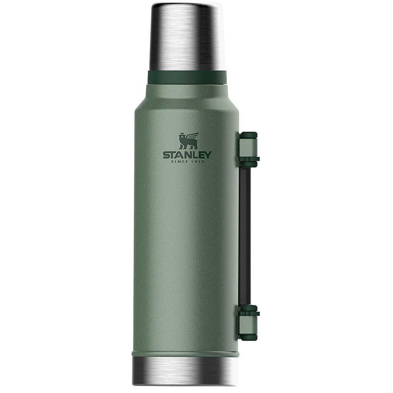 De Stanley Classic vacuümfles is gemaakt van roestvrij 18/8 edelstaal en voorzien van een beschermende groene hamerslaglak. De dubbelwandige vacuümisolatie houdt dranken vele uren warm of koud. De kunststof draaggreep aan de zijkant zorgt ervoor dat de fles gemakkelijk kan worden vervoerd. Boven de flessensluiting bevindt zich een drinkbeker, die eveneens isolerend is uitgevoerd. Door de brede opening kan de fles zeer goed worden gereinigd.