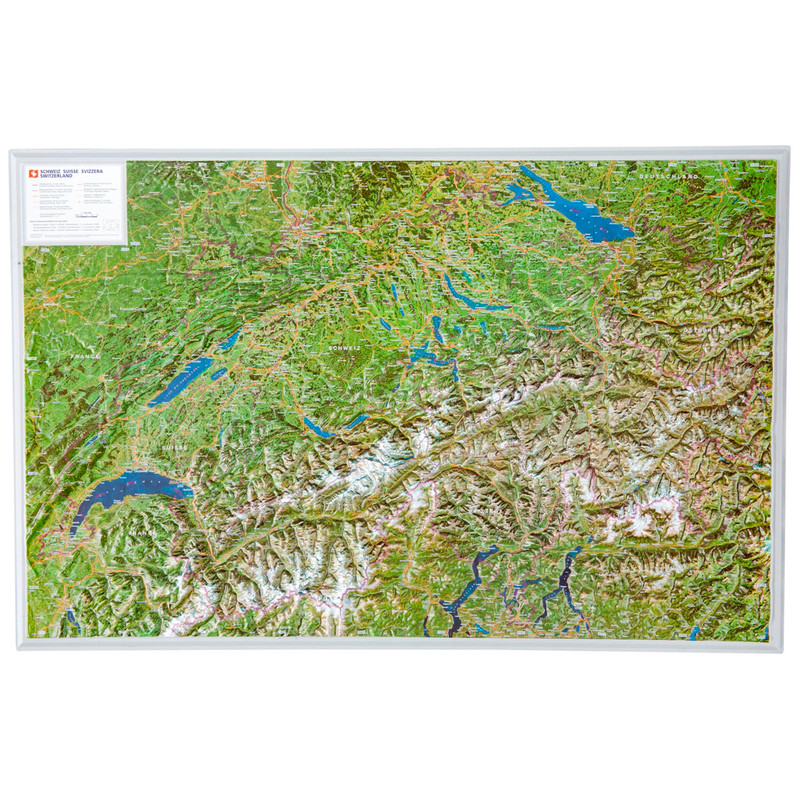 Echte 3D-reliëfkaart van Zwitserland met luchtfoto met reliëfschaduw en gekleurde hoogtelagen die zijn afgeleid van terreinmodellen met hoge resolutie. Er is getracht de gedetailleerdheid van een luchtfoto grafisch weer te geven voor de kijker.