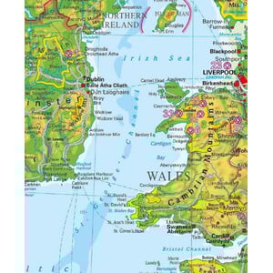 - fysieke weergave van de Britse eilanden en Ierland met UNESCO-werelderfgoedlocaties en nationale parken met overzicht in tabelvorm