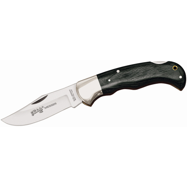 Het zware Herbertz-mes ligt door zijn licht gebogen vorm met vingergroeven uitstekend in de hand. Het lemmet van roestvrij staal 440 wordt direct na het openen veilig vergrendeld door een rugvergrendeling. Het handvatmateriaal, bestaande uit grijs pakkahout en nieuwzilveren beslagen, zit op stabiele messingplaten.