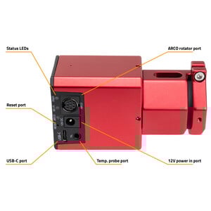 De SESTO SENSO heeft drie poorten. Onder meer één 12 V-voedingspoort voor de motor en de ingebouwde elektronica. Met behulp van de voedingskabel in de verpakking kunnen de motor en de elektronica van stroom worden voorzien via een gewone sigarettenaansteker. Als u een EAGLE hebt, is er ook optioneel een kabel verkrijgbaar om direct via dat kanaal stroom op te wekken. De USB-poort wordt dan gebruikt om de SESTO SENSO aan te sluiten op een besturingscomputer (of de EAGLE). Via een derde poort kunt u een optionele temperatuursensor aansluiten. Op die manier past de focus zich automatisch aan de omgevingstemperatuur aan.