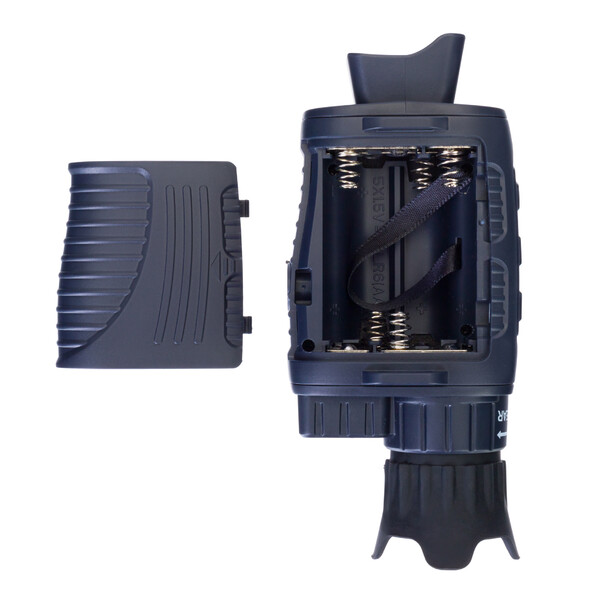 Het optisch-digitale systeem van dit instrument is ondergebracht in een waterbestendige behuizing (IP54) met een ergonomisch ontwerp. De natuurkijker ligt goed in de hand. De batterijen gaan 4 tot 10 uur mee, afhankelijk van hoe intensief de IR-belichting wordt gebruikt. Het instrument wordt geleverd met een tafelstatief dat perfect geschikt is voor langdurige stationaire observaties en beeldstabilisatie bij video-opnames.