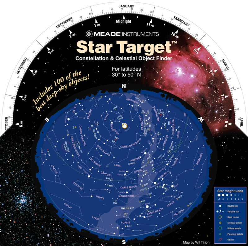De Meade Planisphere is gemakkelijk te gebruiken: Draai de planisfeerkaart in zijn behuizing om de datum en tijd van observatie in te stellen. Wanneer de datum en tijd zijn ingesteld, wordt een gedetailleerde sterrenbeeldenkaart van de nachtelijke hemel zichtbaar op de planisfeer. Is het nu niet donker buiten? Geen probleem! U kunt de planisfeer ook gebruiken voordat het donker wordt om uw sterrenkijken te plannen. De planisfeer werkt het hele jaar door en is ideaal voor observatie op 30-50 graden noorderbreedte. Op de achterkant van de planisfeer staat een gebruiksaanwijzing en een kalender met de jaarlijkse meteorenregen.