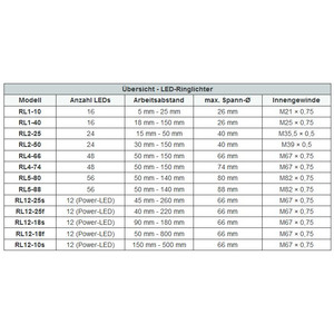 De Power-LED-ringlamp RL12 biedt door de twaalf 3W-LED's een enorme helderheid en is geschikt voor toepassingen met een verhoogde lichtbehoefte, bijvoorbeeld in combinatie met high-speed camera's. Dankzij vijf verschillende varianten met verschillende geometrieën is er voor zowel kleine als grotere werkafstanden de perfecte belichting te vinden.