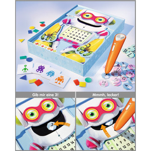 Was ist ein Dreieck? Wie sieht eine 4 aus? Was ist 5 + 2? Die Kinder lösen im tiptoi® Spiel „Der hungrige Zahlen-Roboter“ mathematische Aufgaben und füttern den hungrigen Robby! Je nach Schwierigkeitsstufe lernen sie Formen oder Zahlen kennen oder üben zu rechnen. Für echte Rechenprofis kann der Zahlenraum sogar bis 20 erweitert werden. Der intelligente tiptoi® Stift rechnet mit und überprüft die Lösungen der Kinder. Wenn die jungen Spieler Robbys Aufgaben richtig lösen, tippen sie mit dem tiptoi® Stift auf den Chip und legen ihn in Robbys Mund – und schwupps ist er auch schon im Bauch des hungrigen Roboters verschwunden. Mjamjam! Ob allein oder gemeinsam, mit dem tiptoi® Stift wählen die Kinder interaktiv aus, was sie als Nächstes machen wollen. Wer gerade keine Lust darauf hat, selbst zu rechnen, der wählt das Steuerungszeichen für die Erlebnisebene „Entdecken“, das Auge. Dann erzählt Robby auch mal einen Witz, sein Bauch wird für die angehenden Rechenkünstler zum Taschenrechner und wenn die Kinder Lust haben, singt Robby auch ein Lied mit ihnen. Wichtig: Funktioniert nur mit tiptoi® Stift. Stift muss separat erworben werden.