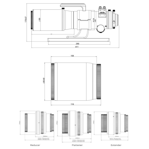De technische gegevens onder de productbeschrijving hebben betrekking op het gebruik van het 80 mm objectief (V80) zonder flattener en reducer.