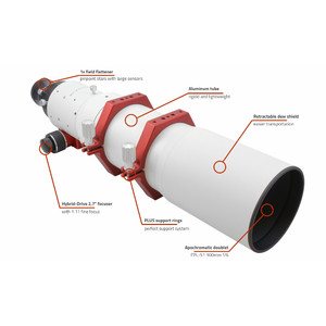 Deze kleurloze refractor (lens FPL-53) is ideaal voor het fotograferen van grote hemellichamen met camera's met een grote sensor (bijv. DSLR). Hieronder vallen ook full-frame reflexcamera's, d.w.z. met sensoren groter dan APS-C formaat. Dankzij het lange focuserpad van 95 mm kan deze refractietelescoop ook visueel worden gebruikt.