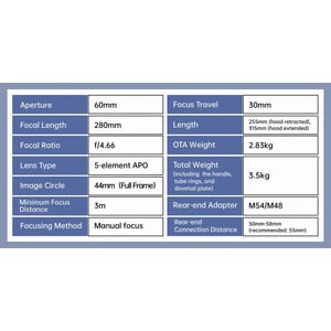 - Snelle openingsverhouding van f/4,66: hoge lichtopbrengst voor het vastleggen van deep-sky-objecten met een groot gezichtsveld, waarbij zelfs bij korte belichtingstijden details zichtbaar blijven.