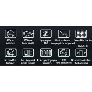 De FF130 wordt geleverd met een uitschuifbare dauwkap, een hoogwaardige CNC-gefreesde buis en decoratief vormgegeven onderdelen. De OTA weegt 10,5 kg - het totale pakket met buisringen en Losmandy-rail weegt 12,5 kg. De stabiele 3,4"-focuser wordt geleverd met een 360°-rotator en een zoekerbeugel. M86-, M68-, M54- en M48-cameraadapters worden eveneens meegeleverd. De M48-adapter heeft een binnenschroefdraad voor de installatie van 2"-filters.