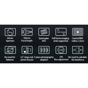 In plaats van extra flatteners aan te schaffen, de backfocus van de flatter te berekenen of de juiste afstand in te stellen, kunt u deze apochromaat eenvoudig uitrusten met verschillende fotografische accessoires, het object scherpstellen en het hele optische systeem is perfect ingesteld voor het maken van opnamen.