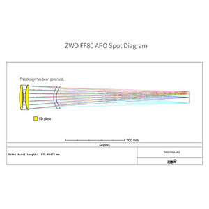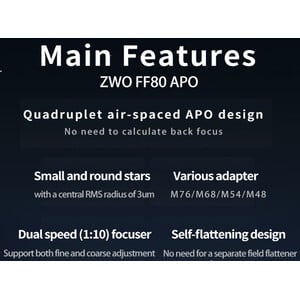 De ZWO FF80 Quadruplet is een zeer compacte apochromatische refractor voor astrofotografie met een gecorrigeerd beeldveld tot volledig formaat en observatie tot in het hoogste vergrotingsbereik. De telescoop heeft een openingsverhouding van f/7,5 bij een brandpuntsafstand van 600 mm. De FF80 heeft een quadruplet-ontwerp met twee ED-glazen, wat een uitstekende onderdrukking van chromatische aberratie mogelijk maakt.