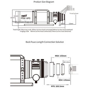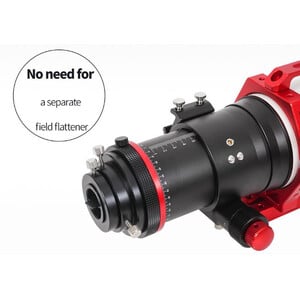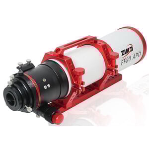 Met de geïntegreerde flattener biedt de FF80 grote voordelen voor astrofotografie: hij verlicht full-frame sensoren en garandeert een fijne afbeelding met puntvormige sterren op de as. De apochromat wordt geleverd met een uitschuifbare dauwkap, een 3" focuser met 360° rotatie, Vixen/GP-zoekerbevestiging en vier verschillende camera adapters (M76, M68, M54 en M48). De tubus zelf weegt 3,9 kg, met buisringen en rail is het gewicht dan 4,7 kg.