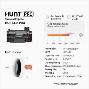 De Hunt 335 Pro van ThermTec zet nieuwe maatstaven in de warmtebeeldtechnologie. Dit veelzijdige opzetstuk, de Hunt 335 Pro, kan snel en eenvoudig op uw dagelijkse optiek worden gemonteerd (adapters optioneel verkrijgbaar) en verandert uw richtkijker in een krachtige nachtkijker. De Hunt 335 Pro is perfect voor veeleisende jachttochten en overtuigt door een uitstekende prijs-kwaliteitverhouding, een hoge resolutie van 384x288 Pixel, een handmatig scherp te stellen 35 mm lens met innovatieve vingerverschuiving, een gevoeligheid van ≤ 15 mK, een indrukwekkend detectiebereik tot 1.800 meter, een groot gezichtsveld van ca. 13,1 meter op 100 meter en een verwisselbaar accusysteem met een gebruiksduur tot 14 uur dankzij de meegeleverde tweede accu, die gemakkelijk via USB-C kan worden opgeladen.