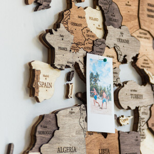De houten kaart geeft uw muur een individuele uitstraling. Markeer met de groene pinnen de plaatsen die u al hebt bezocht en met de rode pinnen uw volgende bestemmingen. De pinnen worden meegeleverd.