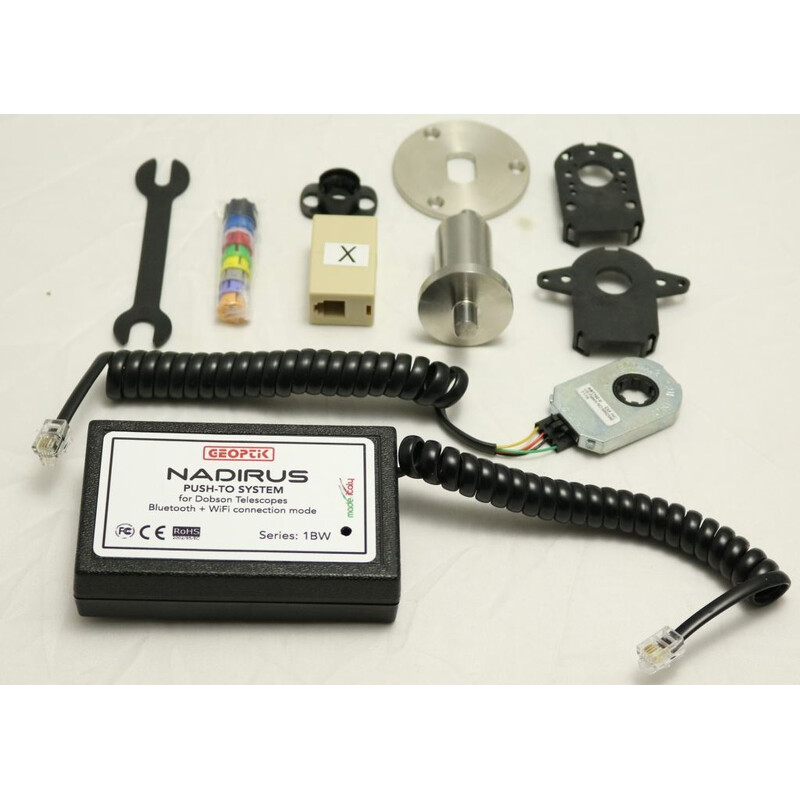 Om PushTo te laten werken, moet u de meegeleverde encoder in de azimutale as van de telescoop installeren. Dit onderdeel registreert de draaiing van de as. De hoogte wordt gemeten door de Nadirus-box, die op de juiste manier aan de spiegelcel moet worden bevestigd. Dit gaat het beste met klittenband, dat u in een bouwmarkt of hobbywinkel kunt verkrijgen. Geoptik heeft hier bewust afgezien van een tweede encoder, omdat de hoogteas bij de verschillende Dobson-telescopen heel verschillend is uitgevoerd. Met de Nadirus-box werkt de hellingsmeting echter altijd.
