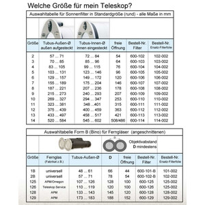 Welke filters passen op uw telescoop? In de productnaam kunt u het bereik zien van de buitendiameter van de telescoopbuis waarop het filter past. Het is niet mogelijk om de filtergrootte rechtstreeks af te leiden uit de telescoopopening, vooral omdat op veel instrumenten permanent een dauwkap is bevestigd. Het is daarom het beste om gewoon zelf de buitendiameter van uw telescoop te messen en dan het juiste filter te kiezen.